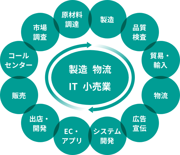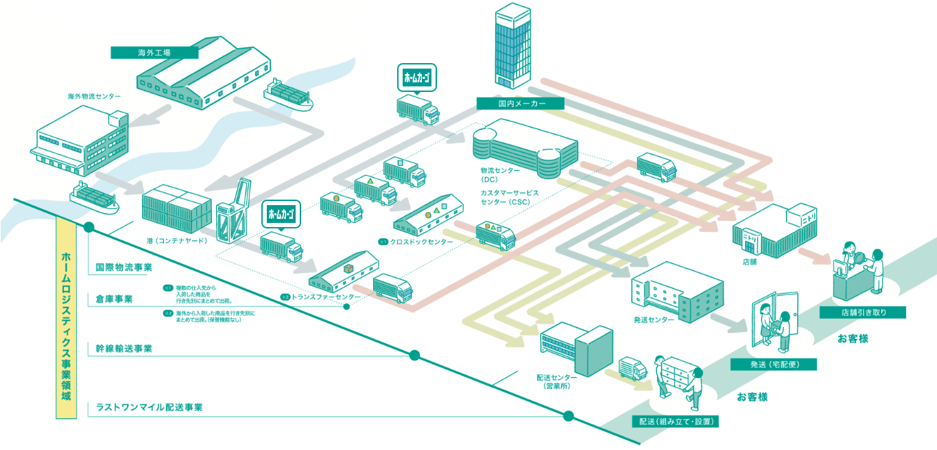 ニトリグループはロマンを達成すべく、さまざまな事業において自前化をおこない、「製造物流IT小売業」という独自のビジネスモデルを構築しました。製造から物流、販売における全てのフェーズを一気通貫で管理することで全体最適を実現しています。ホームロジも安定した商品供給を実現するために多様な業務領域を持ち、現在も事業は進化・拡大し続けています。